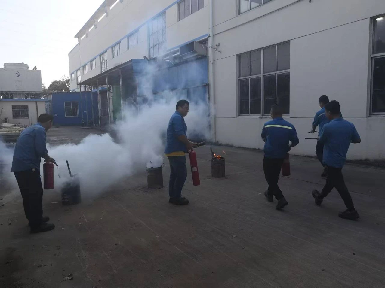 随着演练正式开始,模拟火情场景迅速展开。警报拉响后,全体员工按照规定路线紧急疏散到空旷场地,过程有序而迅速。浓烟弥漫中,多名员工迅速响应,轮流使用灭火器进行灭火,待火苗消失后,对着火点进行仔细检查,确保火源完全熄灭。